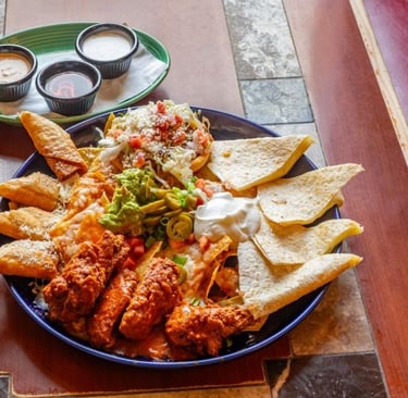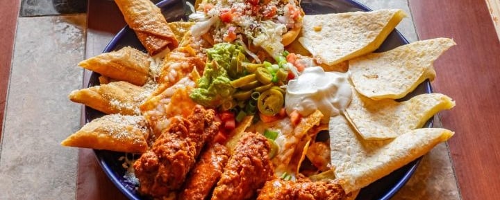 Crispy tortilla chips piled high with melted cheese, seasoned meat, beans & fresh toppings..