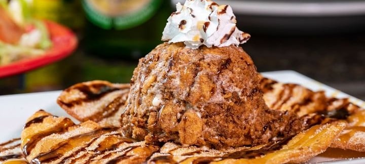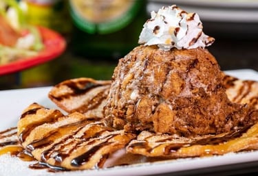 A scoop of ice cream wrapped in a crisp, golden shell. Lightly fried for a warm crunch on the outside and cool, creamy goodness on the inside.